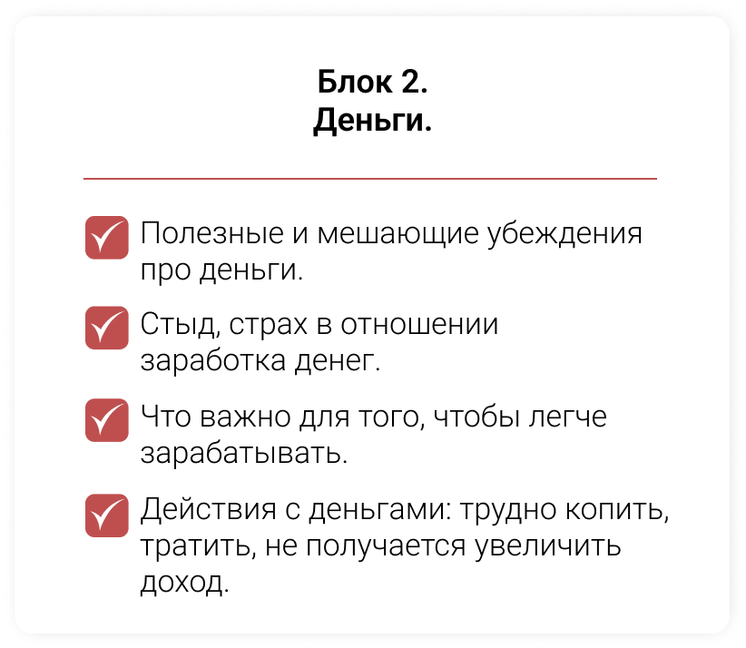 На снижение страха зарабатывать, тратить и предъявлять себя с профессиональной стороны.